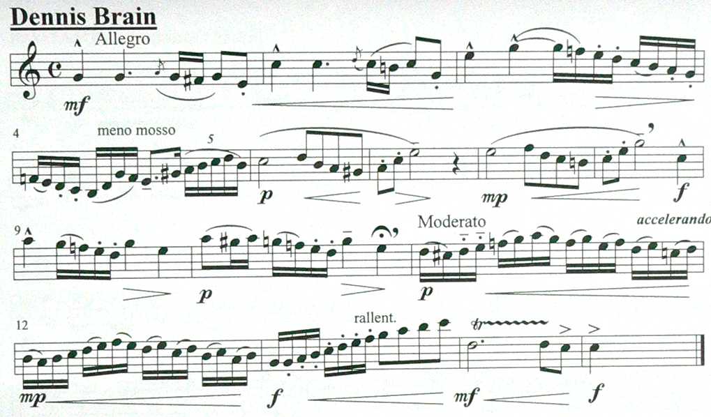 And the cadenza, well, do not pack it full with things you might not master. Do not play material which is not from this movement except some alterations or ornamentations. A shorter cadenza is much better as an overlong cadenza. Very high notes, up to the high f3, might be used by a virtuoso who has the confidence that he will make the climb in 99% of all his attempts, but it would not impress me much. Solidity & some will to serve to the genius Mozarts, this would be more acceptable. This Cadenza is by Dennis Brain. Play it in the same flow as did Dennis Brain but do not implement additional (destroying) holds. |