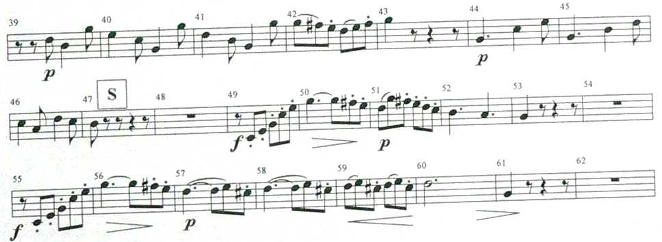 Now comes the first rhythmically tricky point. Care very much to keep the 6/8 rhythm and do not transform it to a rhythm like dotted eighth with succeeding sixteenth, as so often heard. The thumb valve might be of great help if used for the up jump to the f2. There is nothing special to say about MM.43-46 except the care for correct rhythm. M.48 should be begun on T1, but only that note, as the Bb-horn might let it speak clear. Returning to the F-side immediately would result, that the T1 for the upper f2 would be felt as a great help. Do not blare the forte & return to a nice piano in the following MM.50-51. A round up slur c2-f2 would be much appreciated & the succeeding eight notes scale should nicely "jump" down, while the dotted fourths in M.51 were fine "detaché". The next phrase is a mere repetition only, but ending in the threefold repeated three note sequence c2-d2-b-natural1. If you use the F-horn here exclusively, you should take advantage of the beauty of the open d2. Do not push the tempo, as the phrase is shortened in the third measure anyway. The page turn must be performed very quickly or being smart, you had the following measured written on top of this page (if not playing by heart) to avoid the "excitement" of losing the path by a slow page turn. |