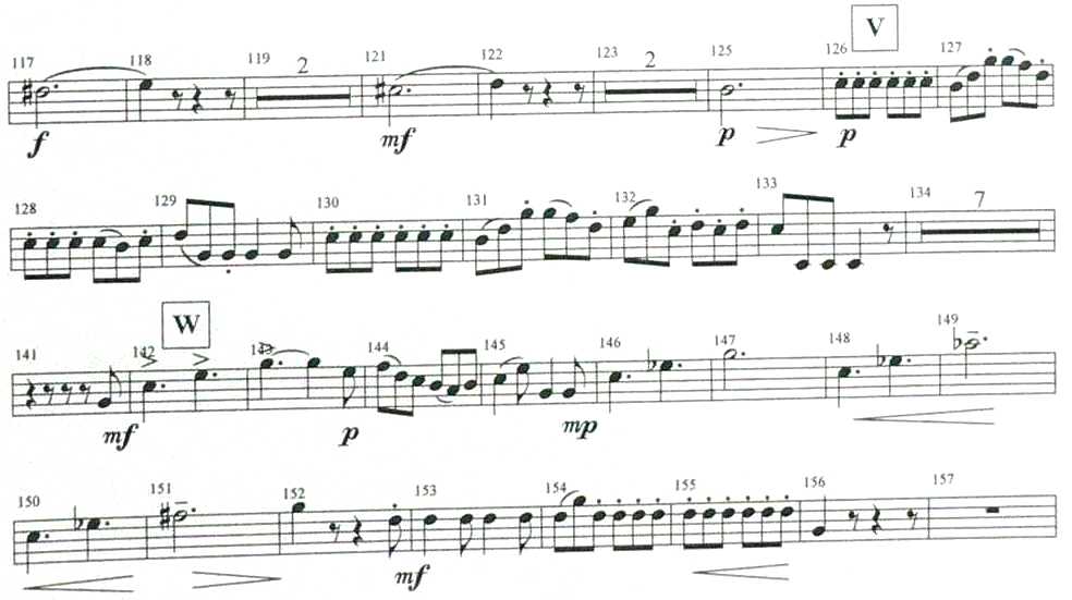 Übertreibe nicht die langen Töne in T.116/120, da sie auch schon von alleine wirken. Der letzte Einsatz mit einem langen Ton in T.124 könnte im mfp stehen statt im piano mit decrescendo, da die Streicher für diesen einen Takt mehr in den Vordergrund kommen sollten. Der Einsatz in T.140 wurde schon früher erklärt. Die Modulation kommt dann in T.145, wo alles sehr weich und etwas geheimnisvoll klingen sollte. Das Schritt-für-Schritt crescendo könnte früher als in den meisten Ausgaben beginnen (T.147). Das ges2 (auch als fis2 zu lesen) in T.148 ist zweifellos mit T2 besser. Beachte den Rhythmus in T.152/153 und verwende natürlich T1 für die Aufwärtsbindung in T.153. |