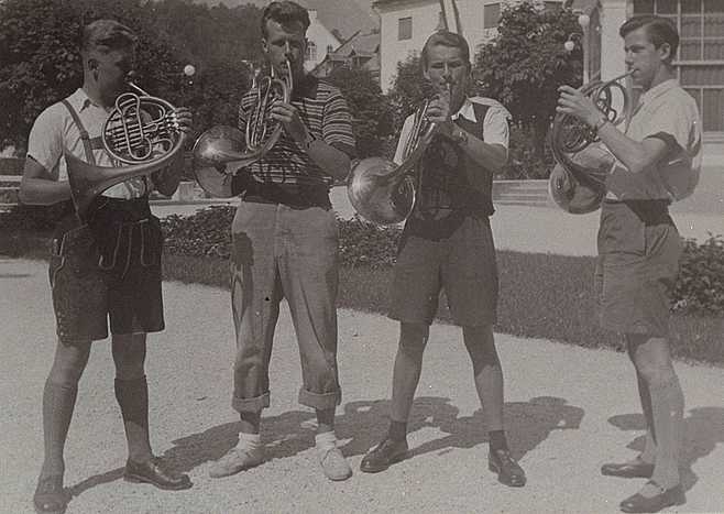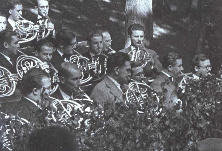 Der WWV (Wiener Waldhorn Verein) bei einer Messe im Lainzer Tiergarten, ganz rechts Gottfried von Freiberg, Leopold Kainz schräg dahinter, in der ersten Reihe mitte noch R. Stark, neben Freiberg sitzt Kreuziger oder Josef Samwald |