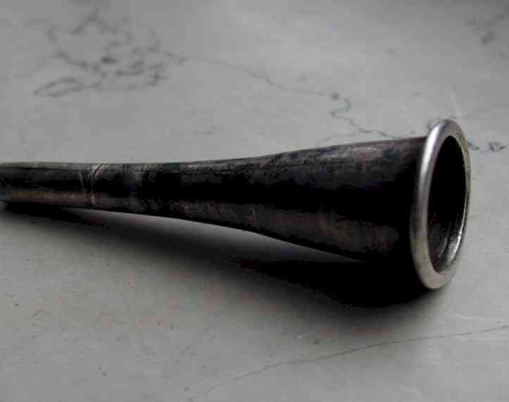 The mouthpiece before restoration (left) the mouth piece after restoration (right below) - the mouth piece container is made of buffalo horn (top right) |