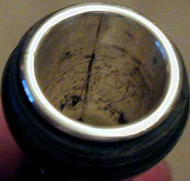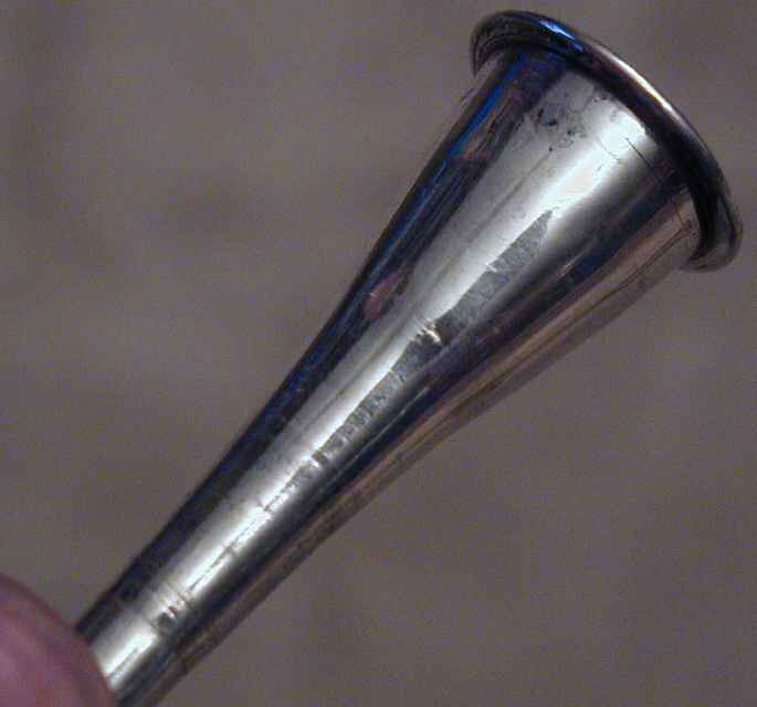 The mouthpiece is made of sterlingsilver sheet metal. The 2,7mms thin rim is soldered on top. The top picture shows the soldering line of the mouthpiece body. - | Das Mundstueck ist aus Sterlingsilberblech zusammengedreht. Der 2,7mm breite Rand ist aufgeloetet. |
