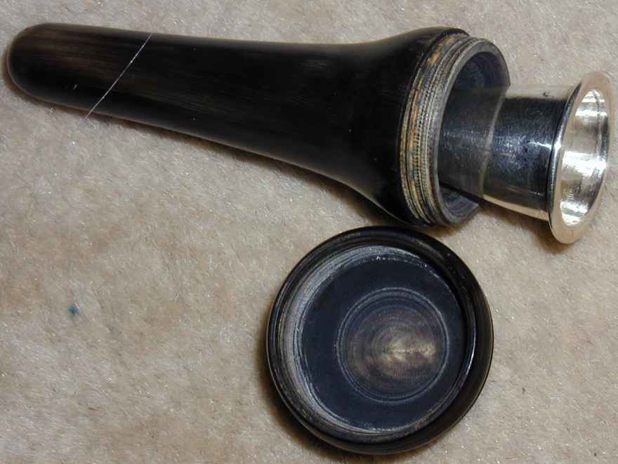 Das Mundstueck vor dem Restaurieren (links) und nach dem Restaurieren (unten). Der Mundstueck Behaelter ist aus Bueffelhorn gedrechselt. |